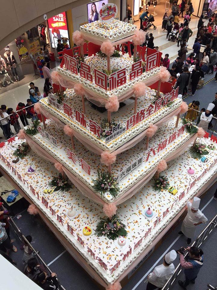 1111日,鄭州老品牌福晶園精心打造的巨型生日蛋糕在某商店繽紛呈現。據負責人介紹,本次所做的蛋糕共計5層,每一層都是長(cháng)方體形狀,長(cháng)度分別是6mX6m,4mX4m ,3mX3m ,2mX2m ,1mX1m,像一座房子似的,相當于一條寬1米長(cháng)66米的巨型蛋糕平鋪,現場(chǎng)可以供30000人一起品嘗!