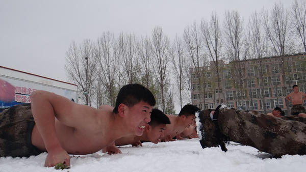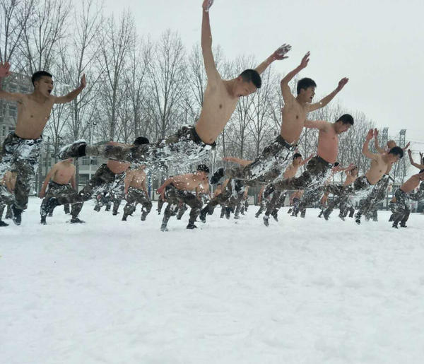 河南全民國防教育中心隊員冰雪中赤膊訓練