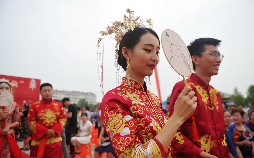 8月6日,河北省黃驊市在南海公園舉辦“執手幸!閻(ài)減負”大型公益集體婚禮。10對新人身穿中式傳統婚服執手入場(chǎng),倡導“喜事新辦、婚事簡(jiǎn)辦”新理念,引領(lǐng)文明節儉的婚嫁新風(fēng)尚。