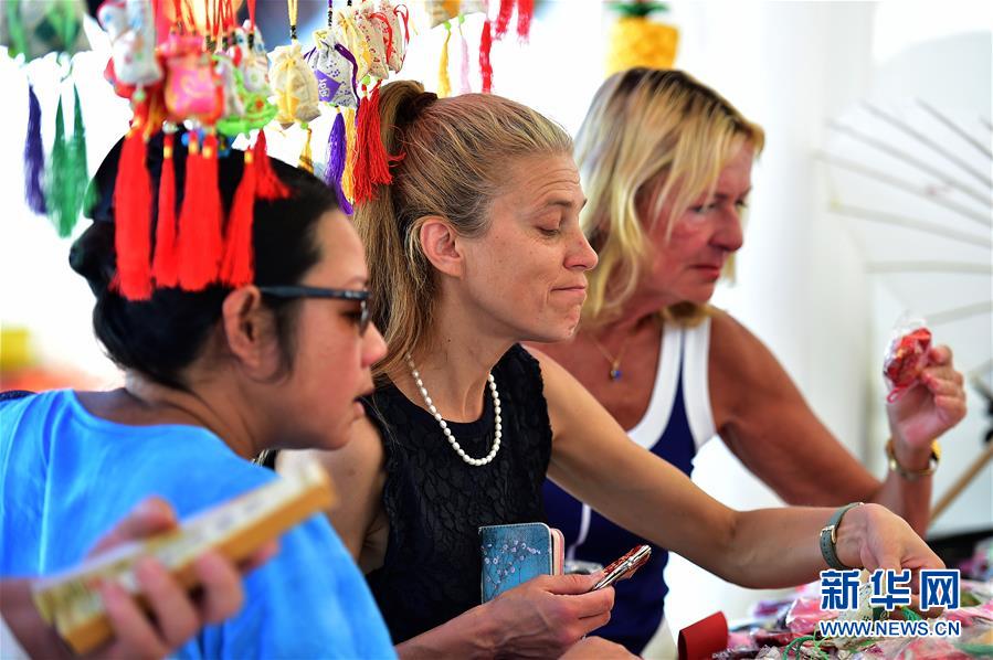 8月30日,在德國法蘭克福,民眾在“中國節”上選購香囊等中國傳統飾品。 德國法蘭克福市30日迎來(lái)“中國節”。市中心衛戍廣場(chǎng)上的戲曲、武術(shù)、民族歌舞、剪紙、茶藝等富有中國傳統文化特色的表演以及中國美食展吸引了大量當地民眾。