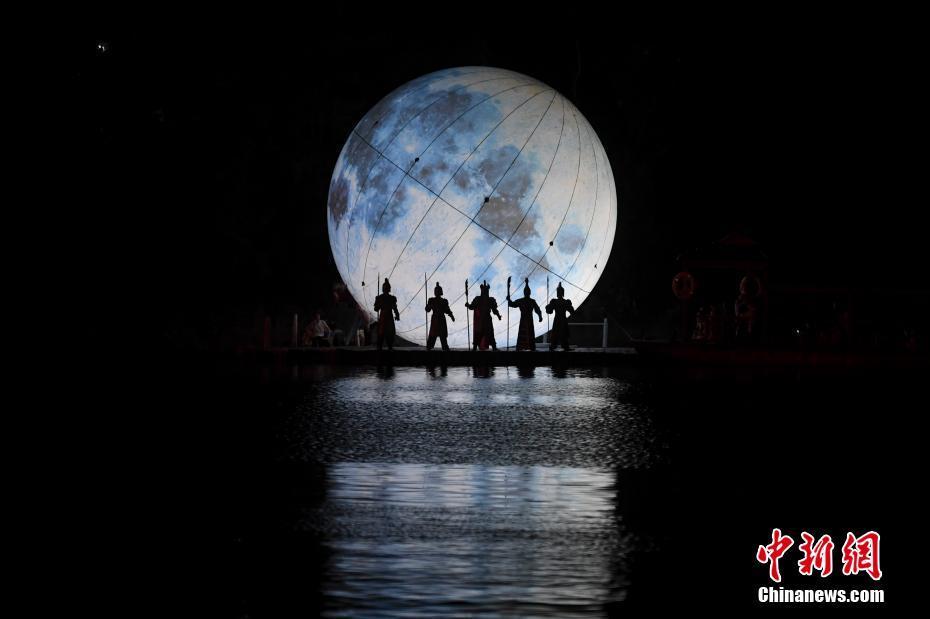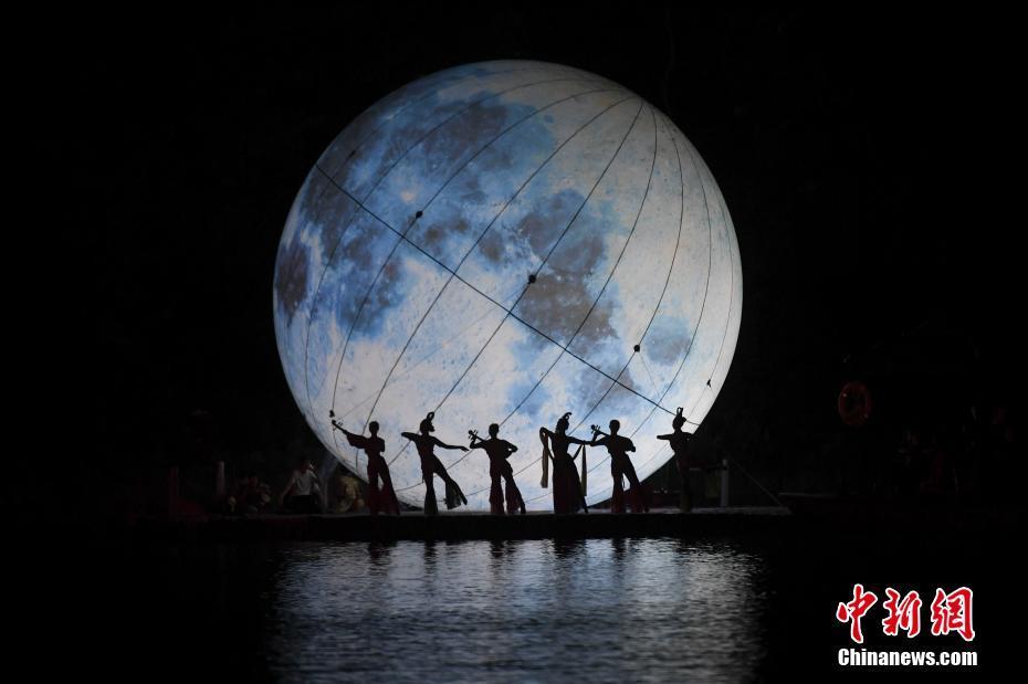 9月10日晚,一場(chǎng)創(chuàng )意的湖面月亮“剪影秀”在長(cháng)沙石燕湖上演,眾多表演者在直徑3米的巨型月亮模型前翩翩起舞,并演繹舞臺劇中古代戰爭的打斗場(chǎng)面,以此讓觀(guān)眾感受中秋節日的氣氛。圖為舞者在湖面的巨型月亮前翩翩起舞。