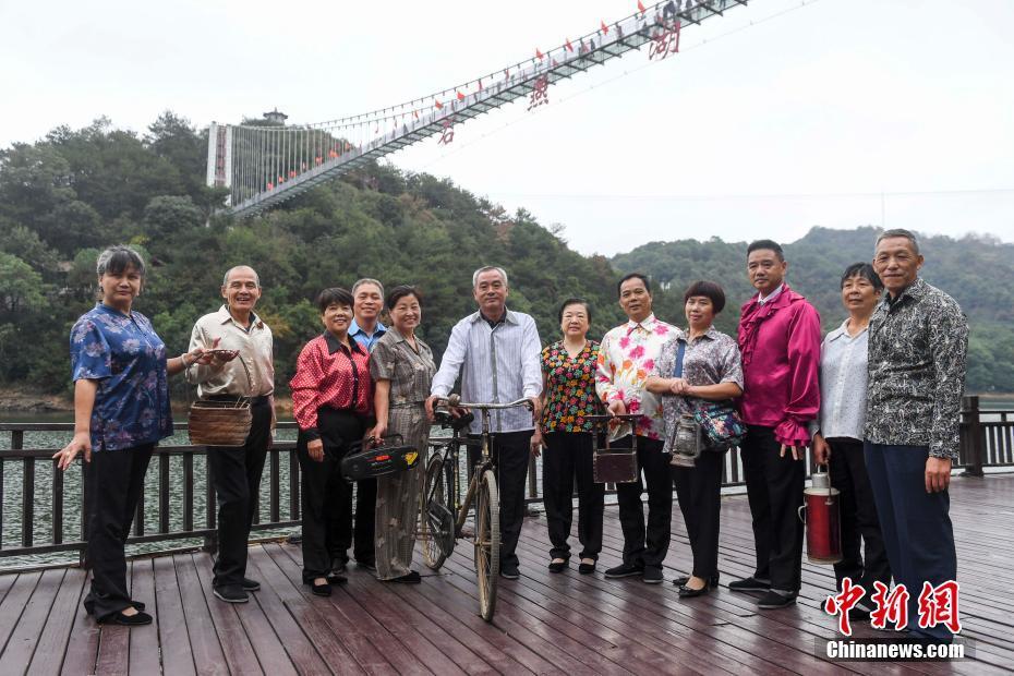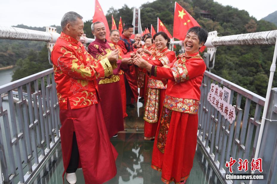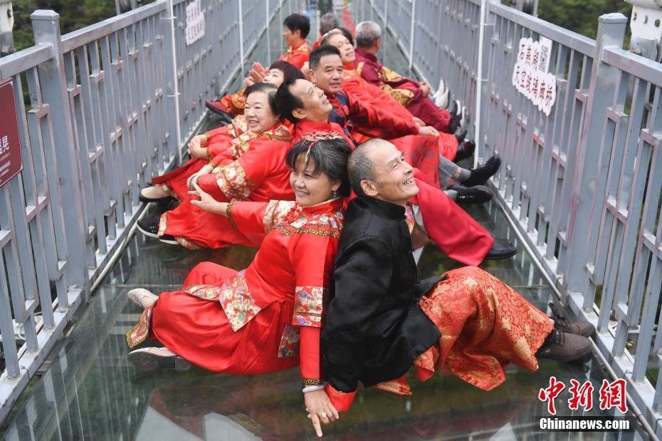10月6日,老人們登上高空玻璃橋拍攝結婚照。當日,重陽(yáng)節前夕,6對婚齡近40年的老人們來(lái)到長(cháng)沙石燕湖拍攝復古結婚照,以此迎接即將到來(lái)的重陽(yáng)節。