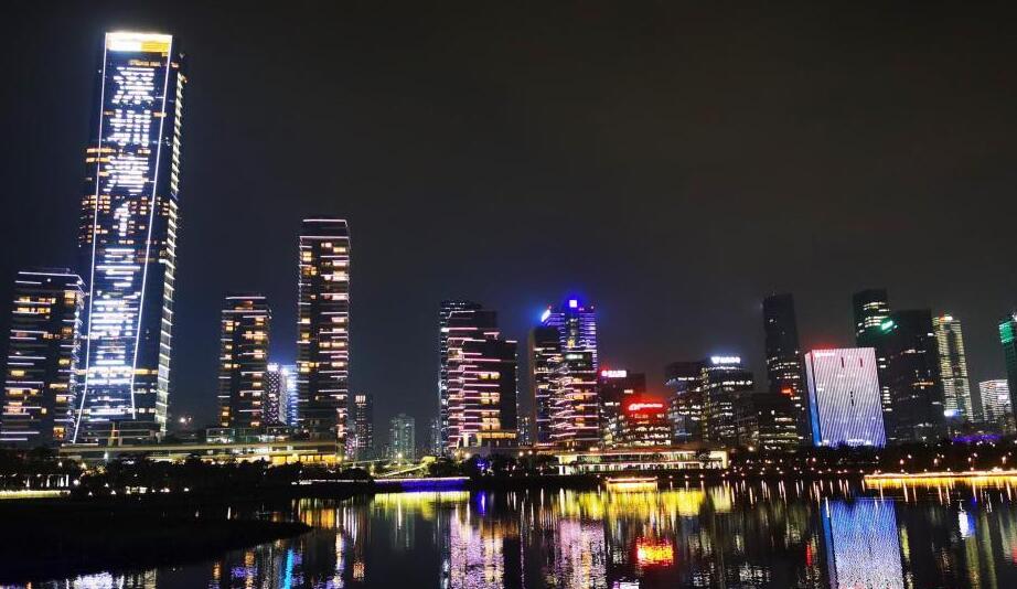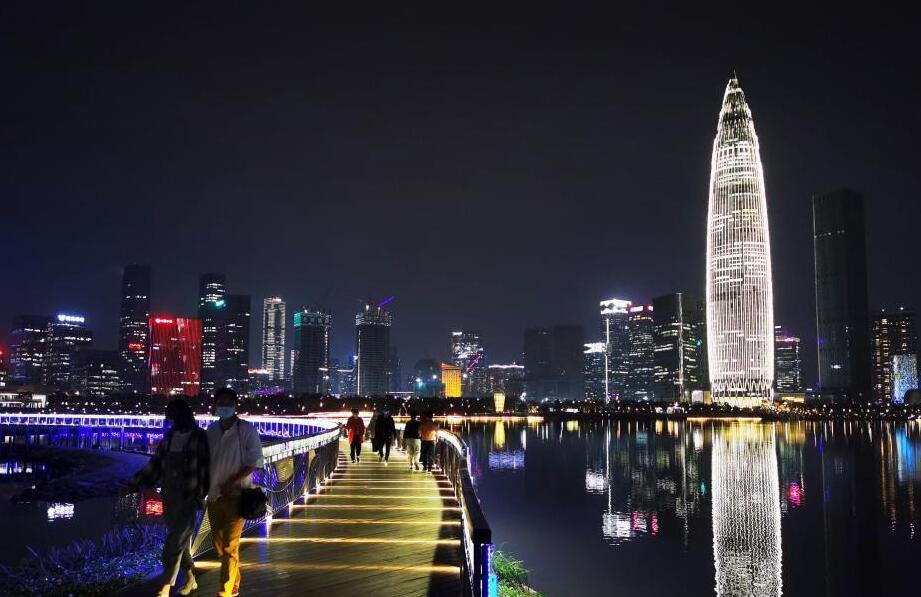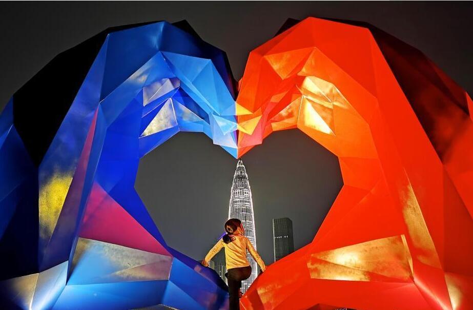 廣東深圳人才公園的“愛(ài)心”雕塑與地標建筑“春筍”交相輝映,燈光璀璨夜色美。