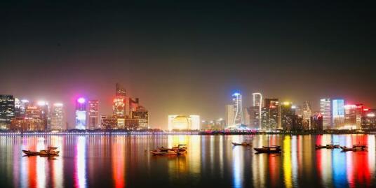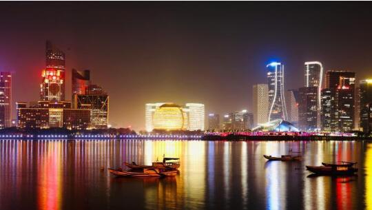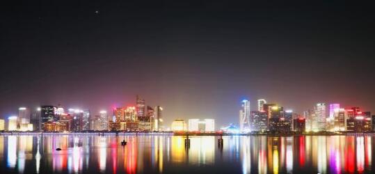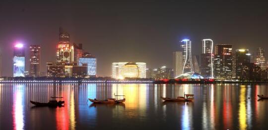 杭州錢(qián)江新城夜景在錢(qián)塘江面形成絢麗倒影。