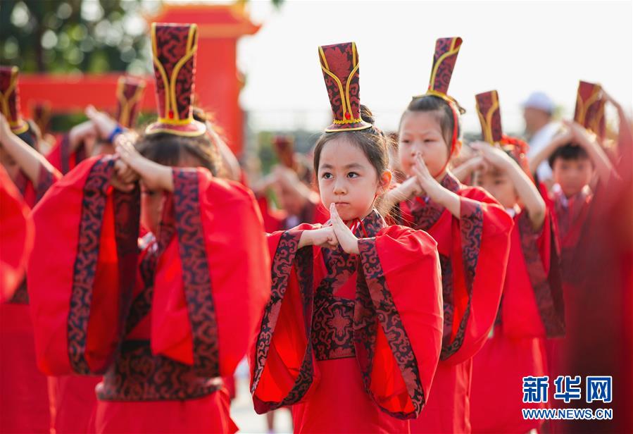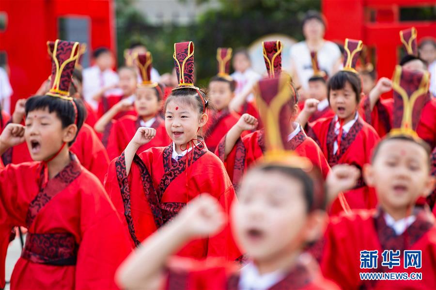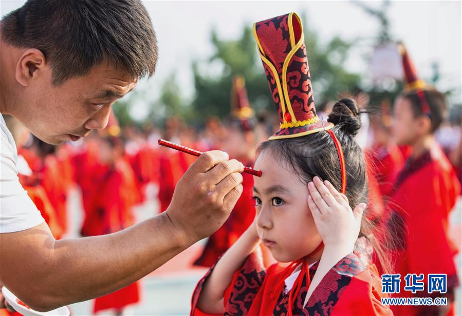 9月9日,武安市中山小學(xué)新生在“入泮禮”上宣誓。 當日,河北省武安市中山小學(xué)組織開(kāi)展新生“入泮禮”儀式,300余名新生身著(zhù)傳統服飾參加端正衣冠、點(diǎn)砂開(kāi)智、啟蒙開(kāi)筆等活動(dòng),體驗傳統習俗。