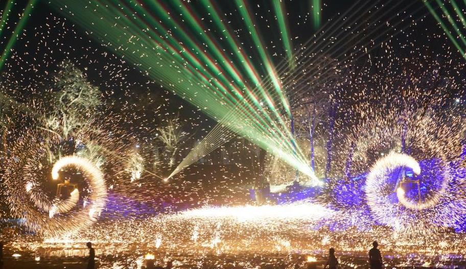 2月25日,農歷正月十四晚,河南開(kāi)封萬(wàn)歲山景區上演傳統民俗“打鐵花”,慶祝元宵佳節。圖為震撼的鐵花秀。