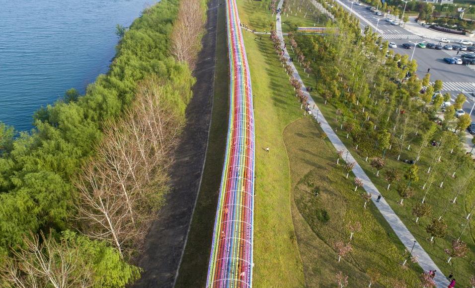3月28日,湖北省襄陽(yáng)市,人們在沿江大道七彩風(fēng)車(chē)長(cháng)廊里游玩。在襄城區沿江大道的河堤綠道上,一條長(cháng)達300米、由十萬(wàn)個(gè)七彩風(fēng)車(chē)搭建的彩虹走廊吸引了眾多游客。漫步在炫麗斑斕的風(fēng)車(chē)長(cháng)廊,仿佛走進(jìn)夢(mèng)幻般的彩虹世界。一陣風(fēng)吹過(guò),只聽(tīng)見(jiàn)快速旋轉的風(fēng)車(chē)發(fā)出嘩啦啦的聲響,仿佛傳來(lái)春天的問(wèn)候,成為一道色彩靚麗、壯觀(guān)無(wú)比的風(fēng)景線(xiàn)。